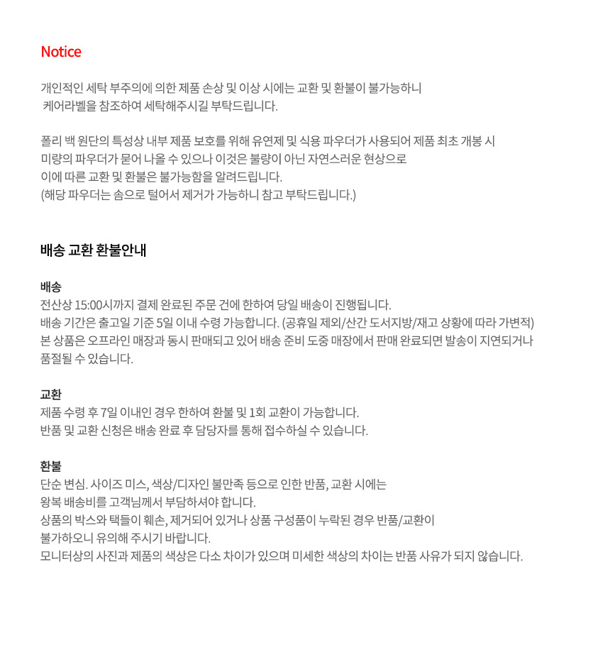 - 고객 변심으로 인한 교환/반품은 상품 수령 후 7일 이내 가능합니다.