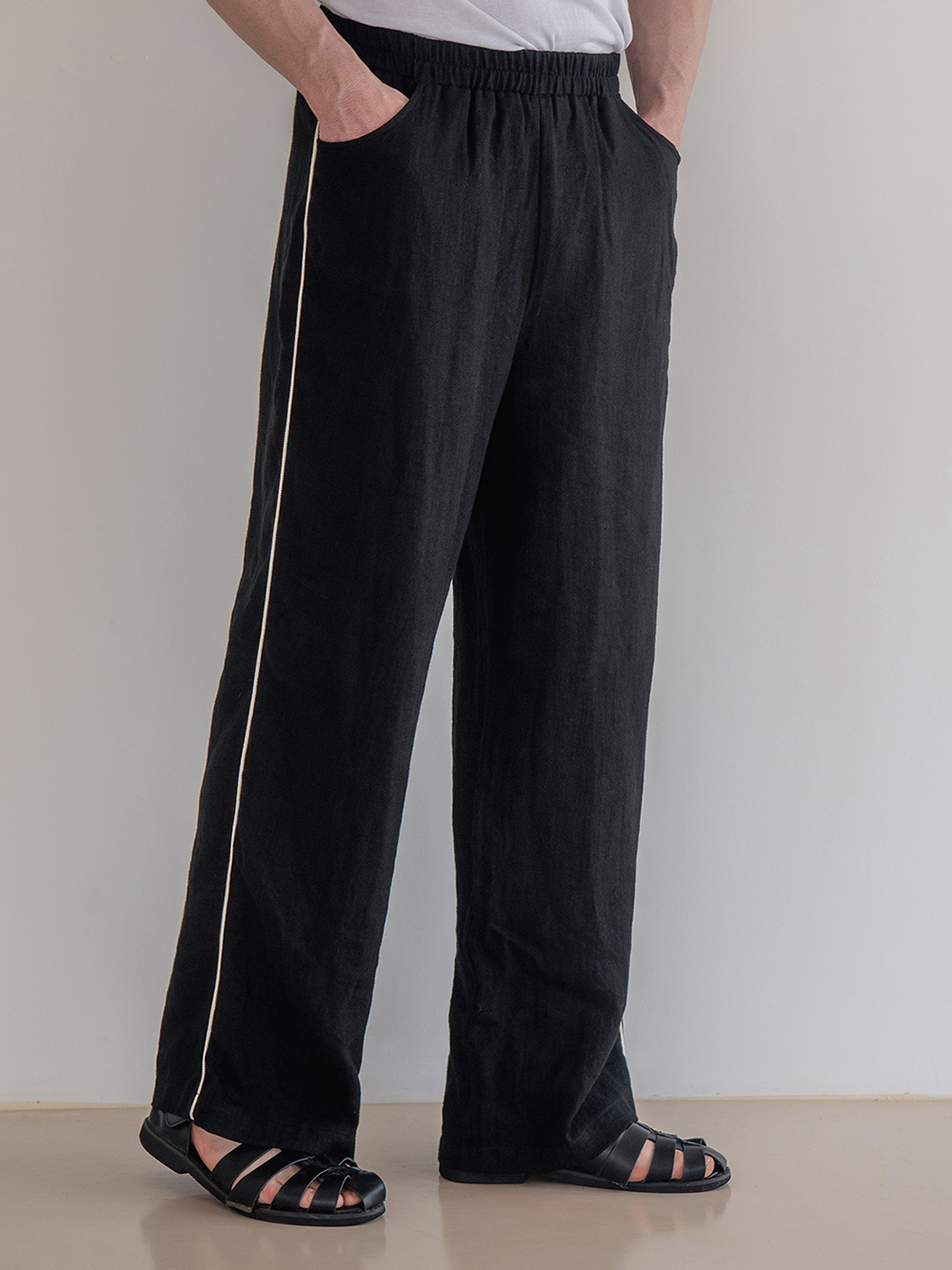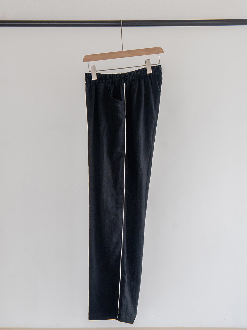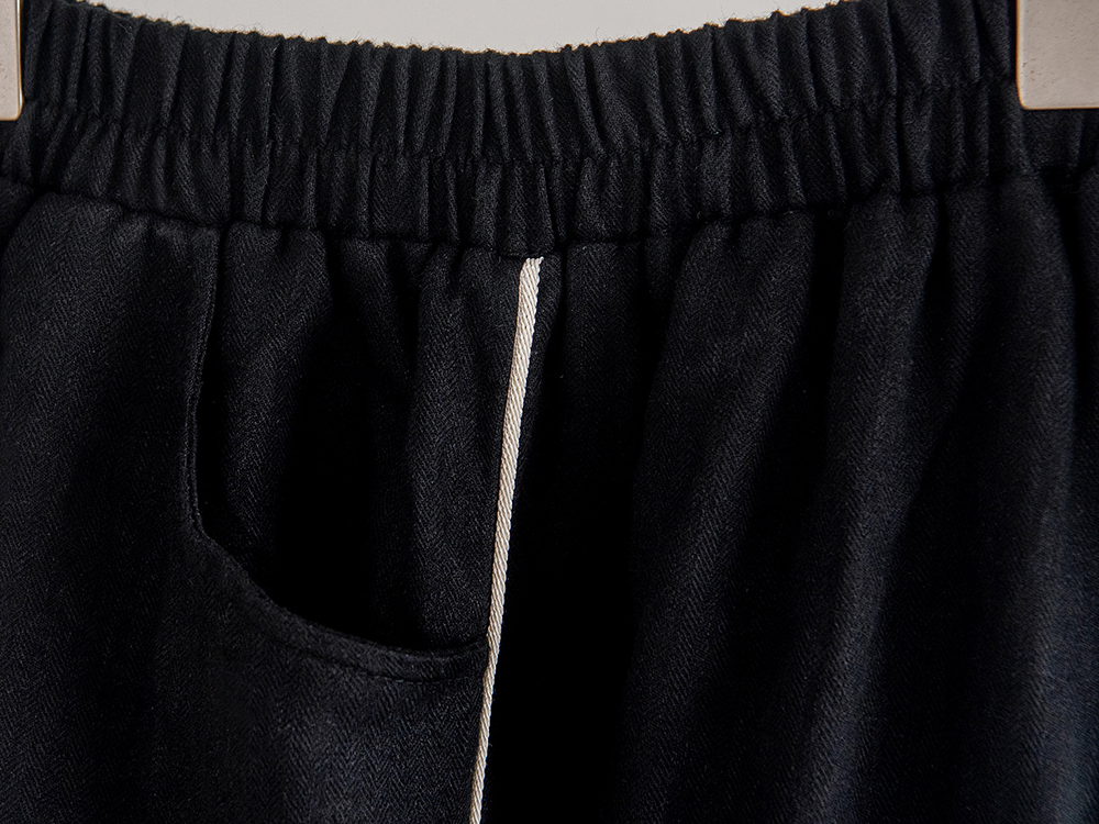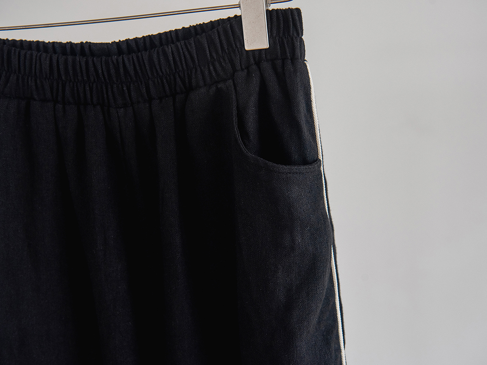 은은한 헤링본 패턴의 리넨 블랙 팬츠입니다. 허리 밴딩 처리로 인해 구매 시 실측 사이즈 꼭 참고 바랍니다.
