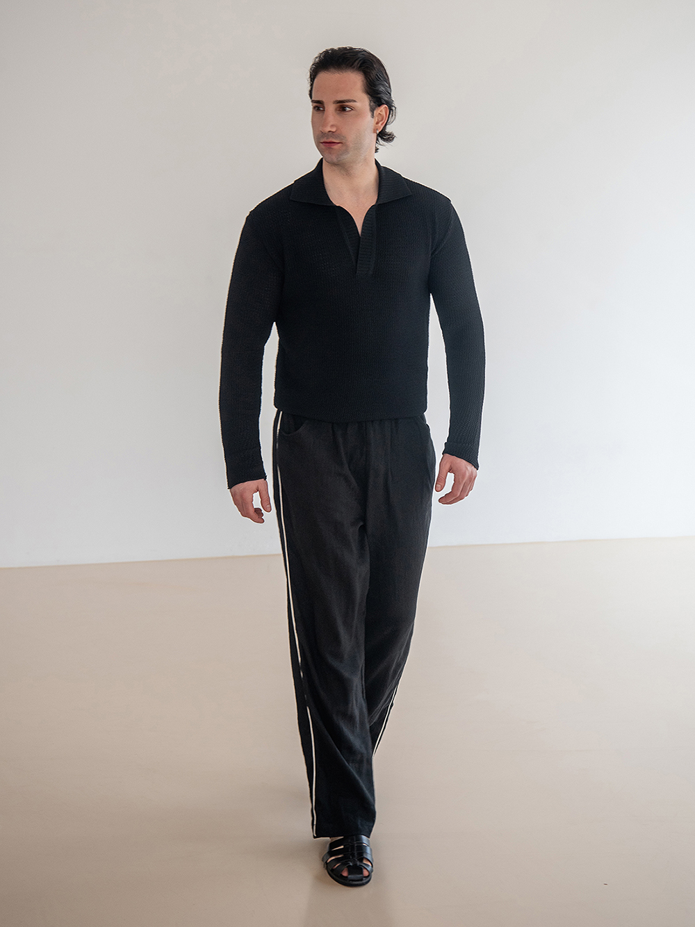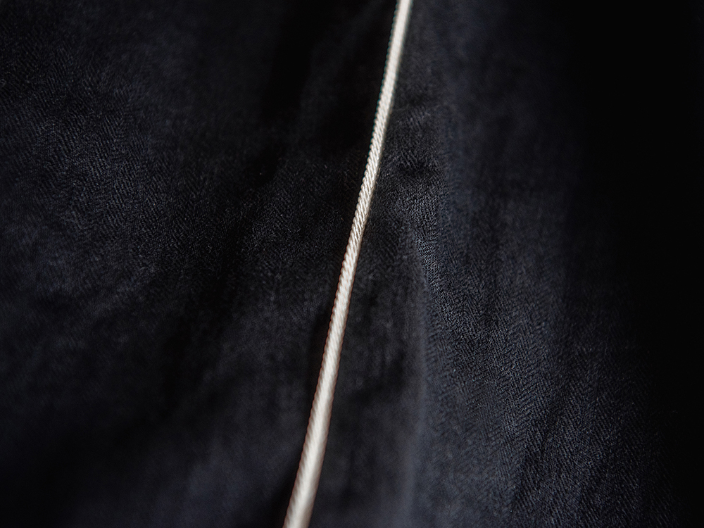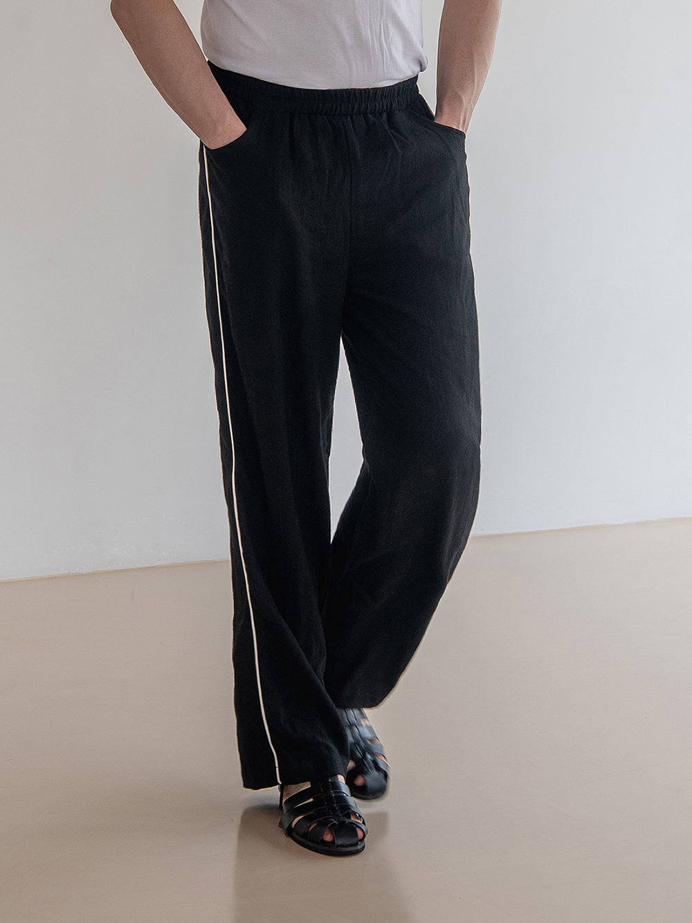 은은한 헤링본 패턴의 리넨 블랙 팬츠입니다. 허리 밴딩 처리로 인해 구매 시 실측 사이즈 꼭 참고 바랍니다.