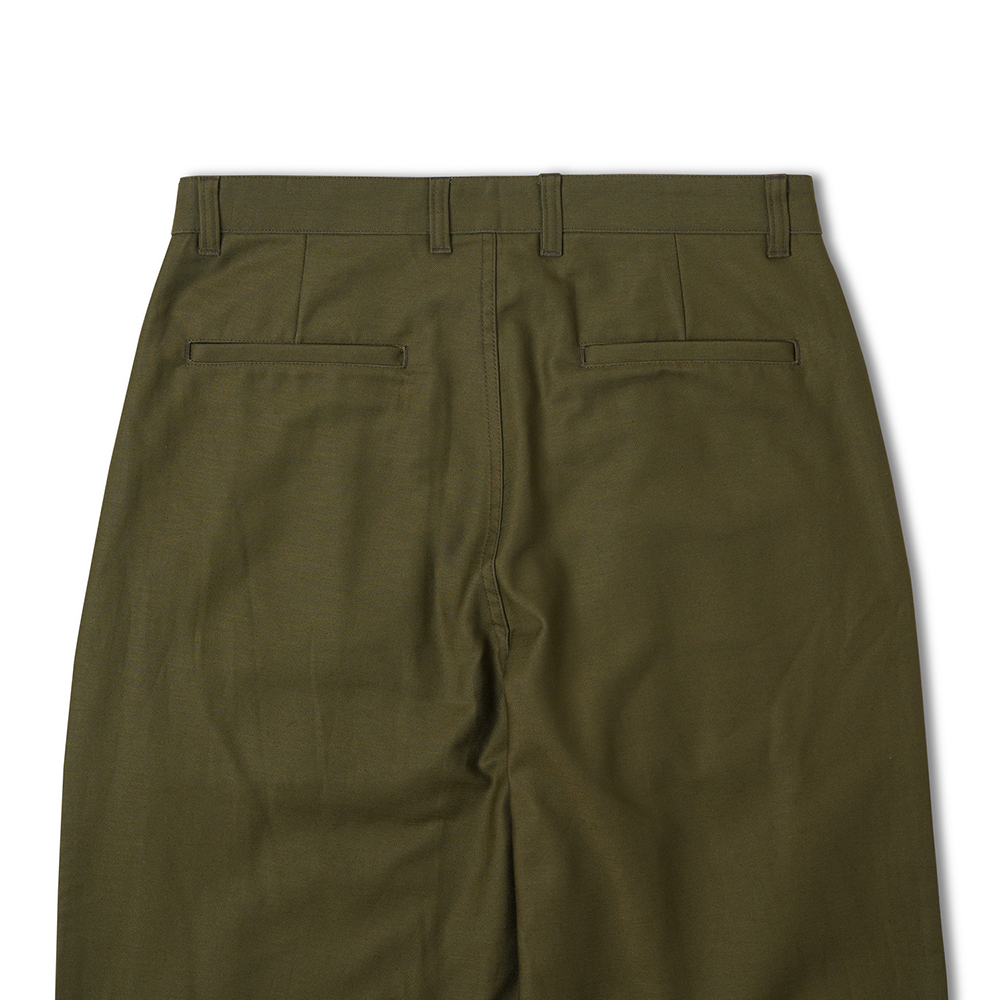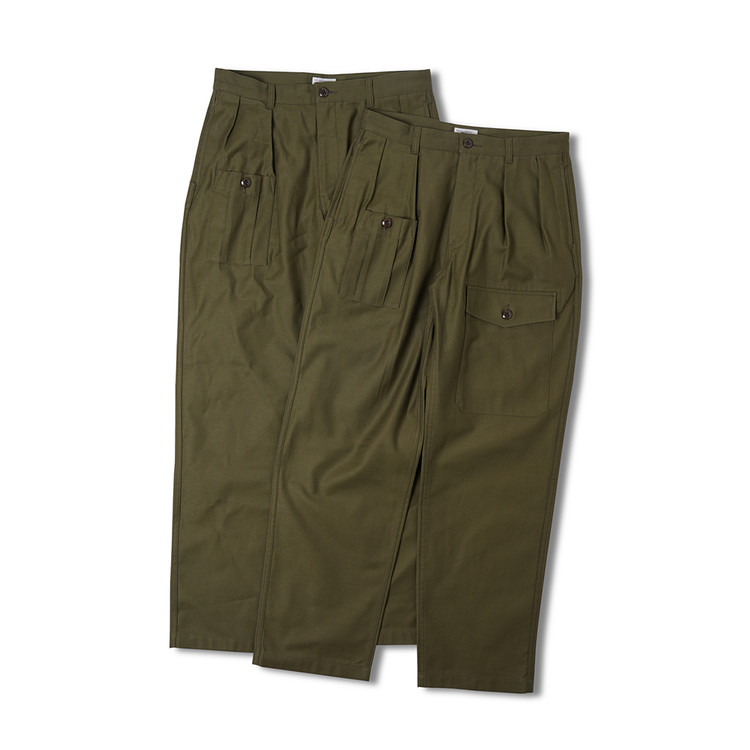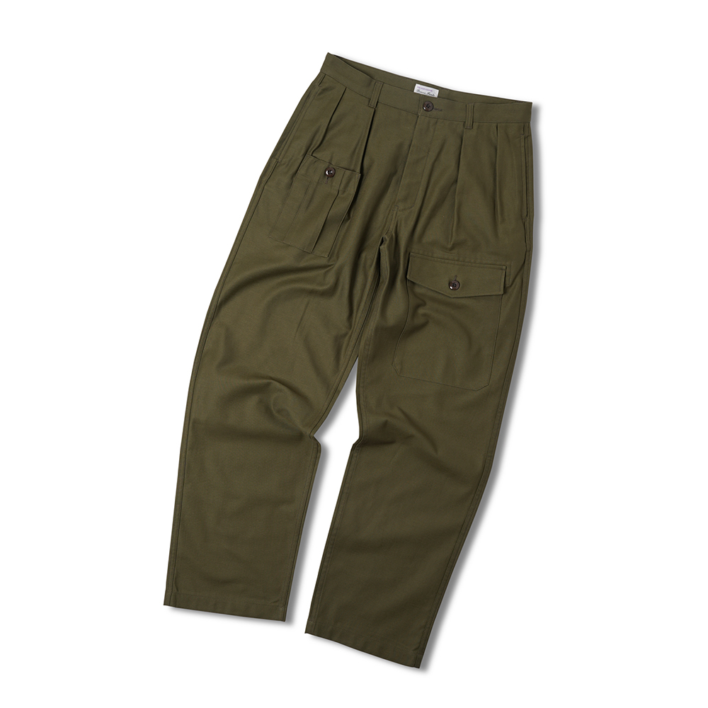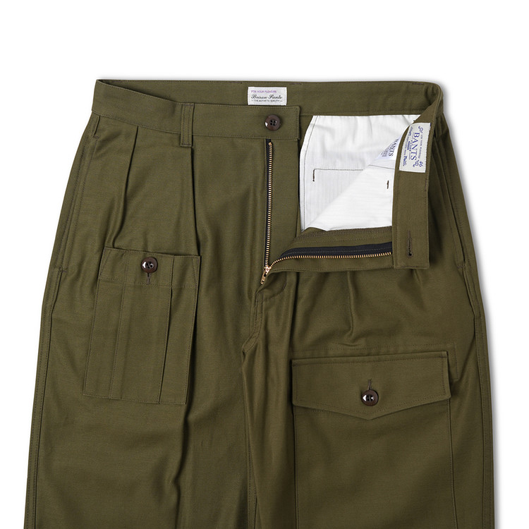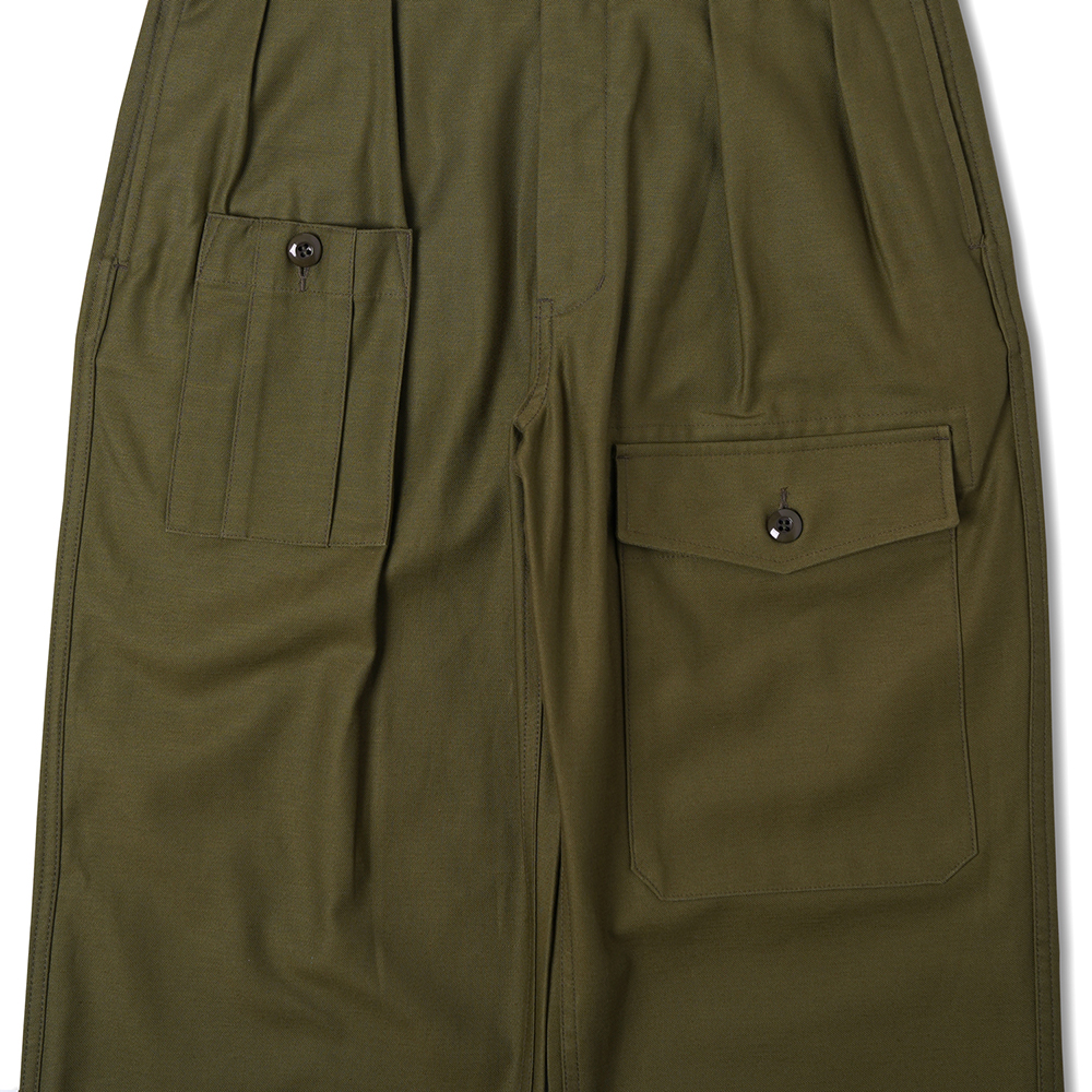COSMO TEXTILE社의 밀리터리 백 새틴 원단을 사용한 브리티시 배틀 드레스 트라우저입니다. 고르지 않은 무라사를 채택한 이 원단은 보다 캐주얼한 텍스쳐를 보여주며 세탁 시 워싱감과 독특한 아타리감이 나타납니다. 1943년에 트로피칼 배틀 유니폼을 채용한 영국군은 1941년 미국 루즈벨트 대통령이 제정한 랜드리스 법에 의해 미국에서 생산된 그린 컬러의 제품을 공급받게 됩니다. 주로 미군에서 사용되는 HBT 원단과 버튼 및 버클이 사용되었습니다. 반츠에서는 이에 힌트를 얻어 미군에서 많이 사용한 백 새틴 원단을 사용하게 되었습니다. 앞판의 비대칭의 패치 포켓과 역방향의 투턱 디테일을 재현하였으며, 당시에 생산되던 제품답게 너른 허벅지 너비와 테이퍼드 실루엣을 구현하였습니다. 허리 부분은 좀 더 현대적인 디자인을 적용시켜 착용하기 쉽게 디자인 하였습니다. 각 디테일을 정교하게 마감한 봉제와 바텍으로 퀄리티를 높였습니다.