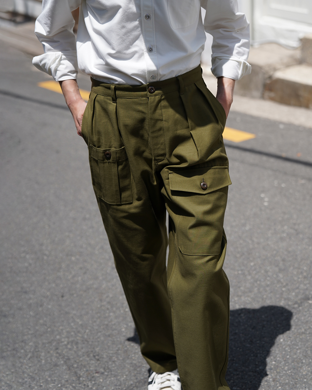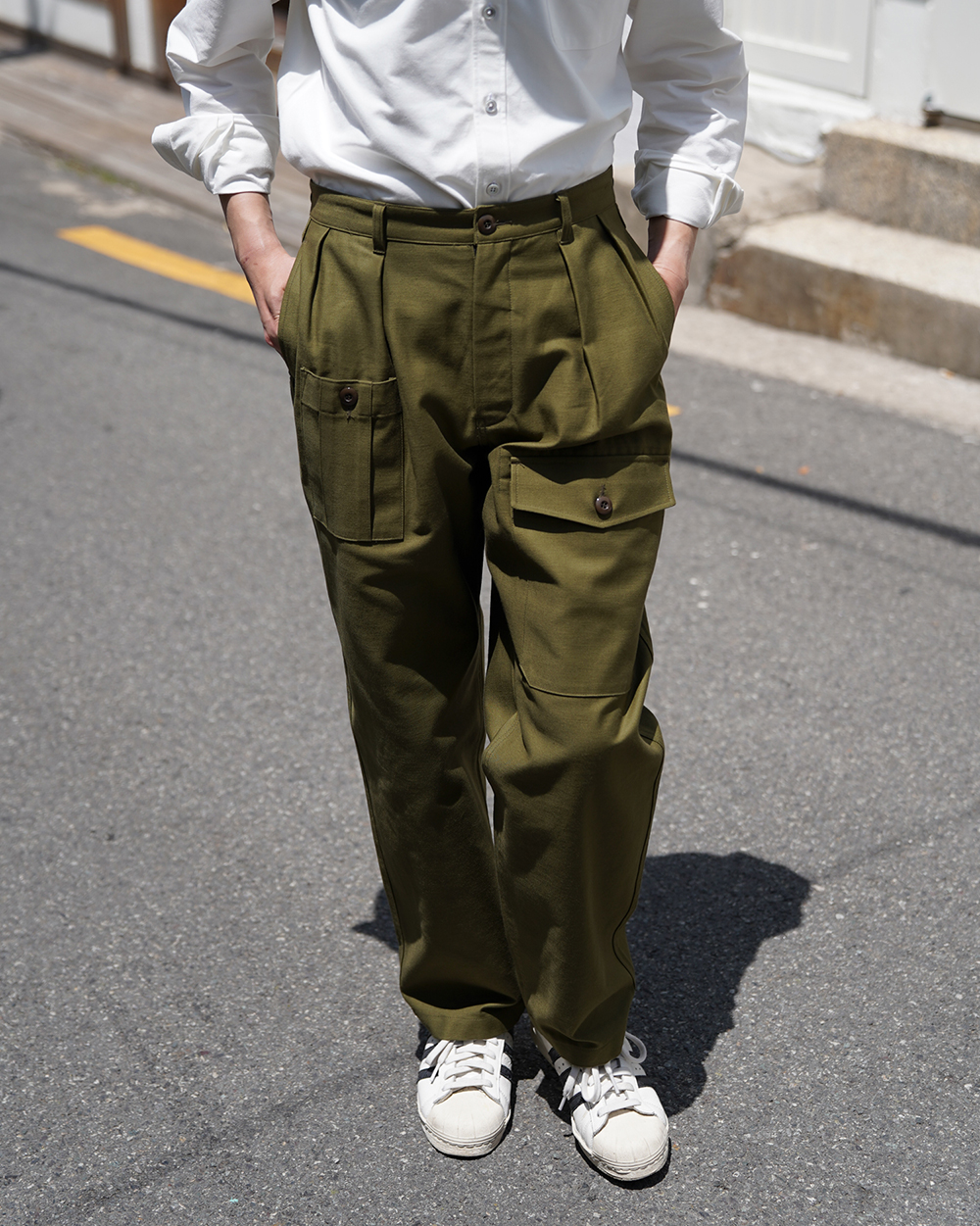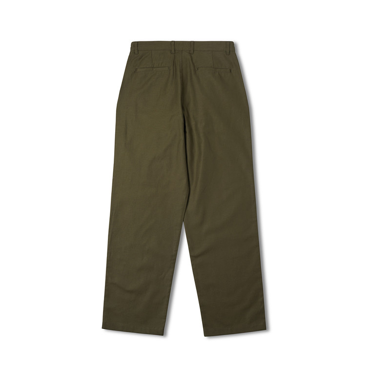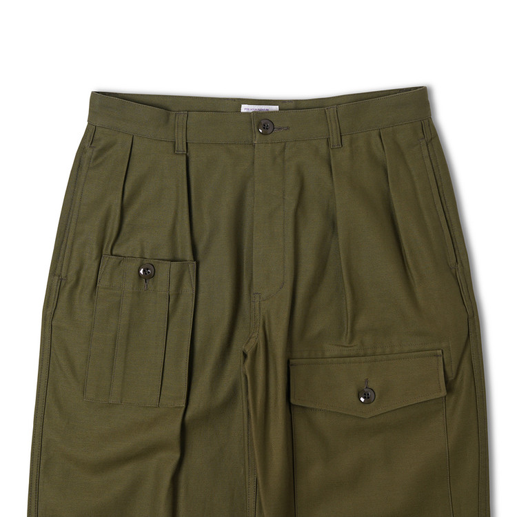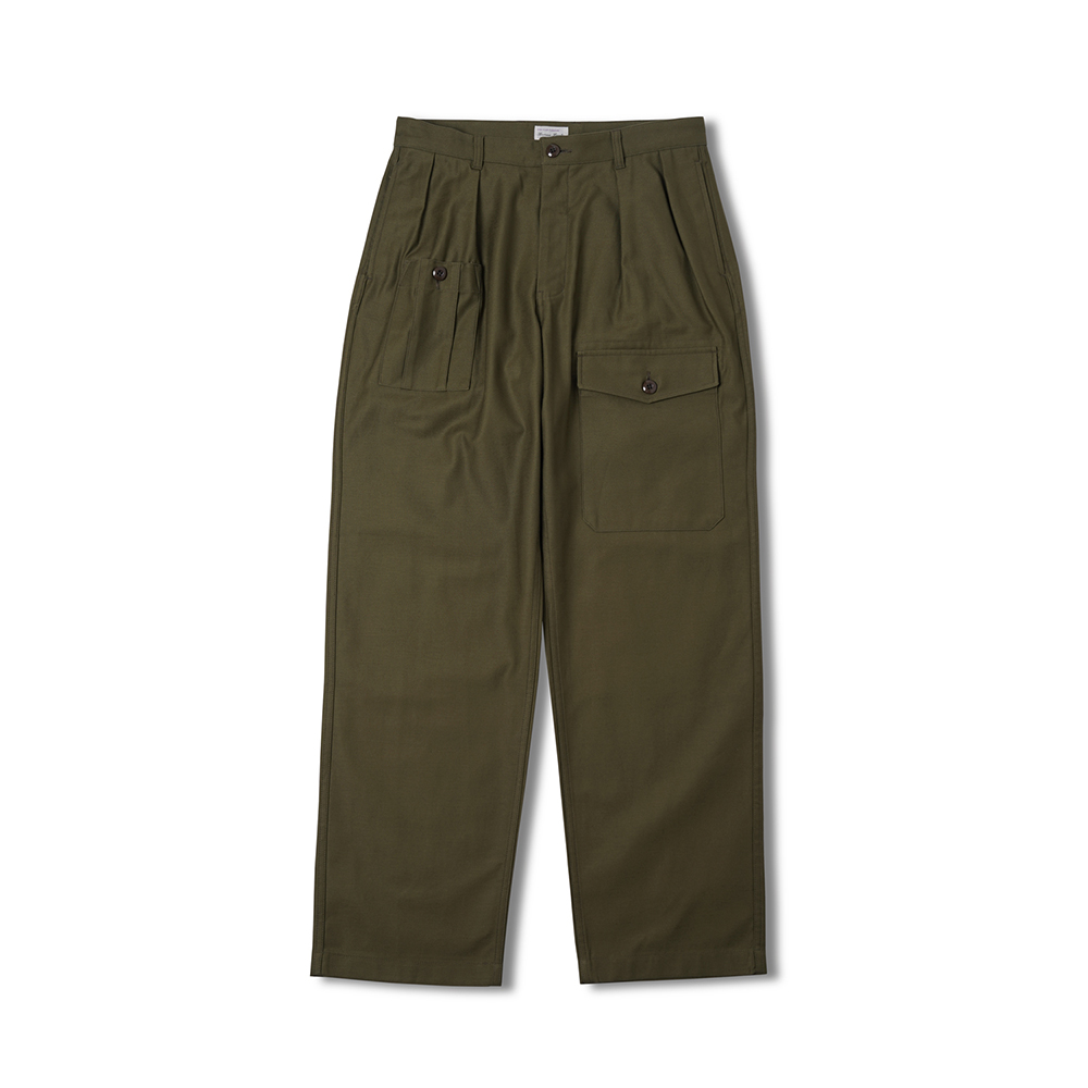 COSMO TEXTILE社의 밀리터리 백 새틴 원단을 사용한 브리티시 배틀 드레스 트라우저입니다. 고르지 않은 무라사를 채택한 이 원단은 보다 캐주얼한 텍스쳐를 보여주며 세탁 시 워싱감과 독특한 아타리감이 나타납니다. 1943년에 트로피칼 배틀 유니폼을 채용한 영국군은 1941년 미국 루즈벨트 대통령이 제정한 랜드리스 법에 의해 미국에서 생산된 그린 컬러의 제품을 공급받게 됩니다. 주로 미군에서 사용되는 HBT 원단과 버튼 및 버클이 사용되었습니다. 반츠에서는 이에 힌트를 얻어 미군에서 많이 사용한 백 새틴 원단을 사용하게 되었습니다. 앞판의 비대칭의 패치 포켓과 역방향의 투턱 디테일을 재현하였으며, 당시에 생산되던 제품답게 너른 허벅지 너비와 테이퍼드 실루엣을 구현하였습니다. 허리 부분은 좀 더 현대적인 디자인을 적용시켜 착용하기 쉽게 디자인 하였습니다. 각 디테일을 정교하게 마감한 봉제와 바텍으로 퀄리티를 높였습니다.