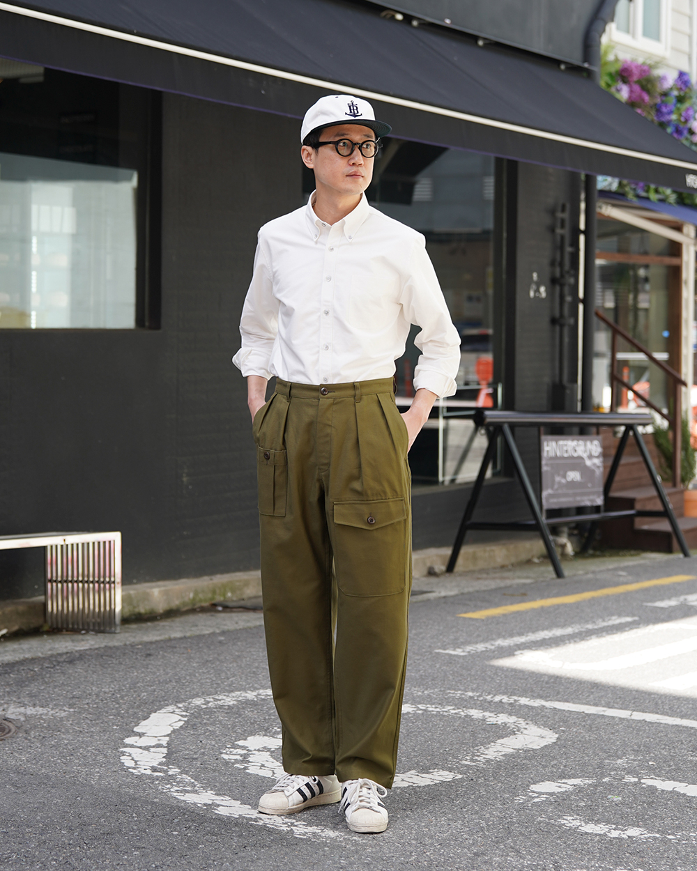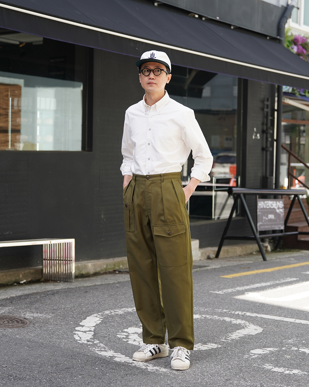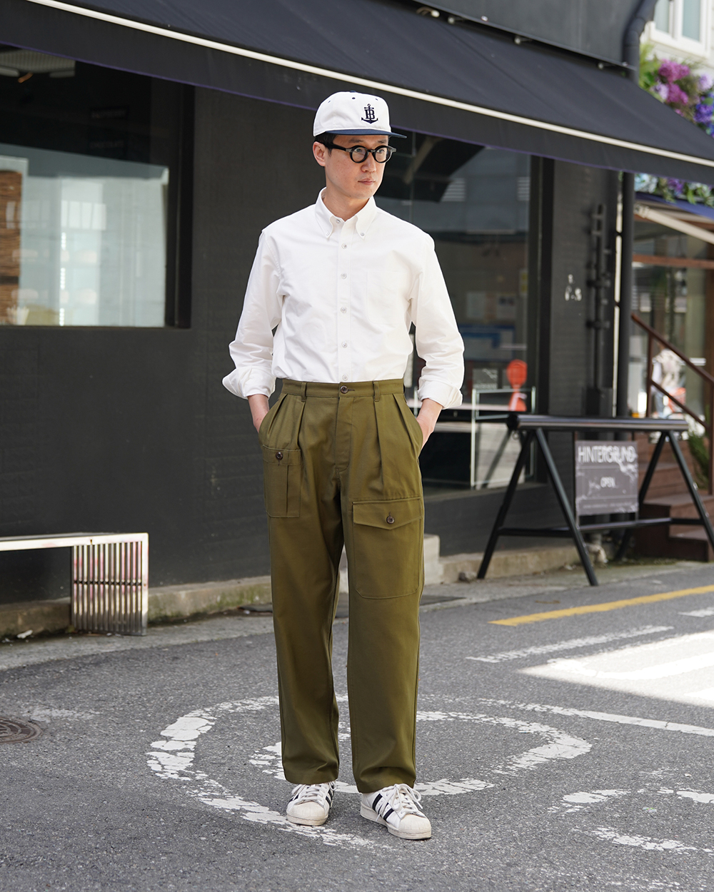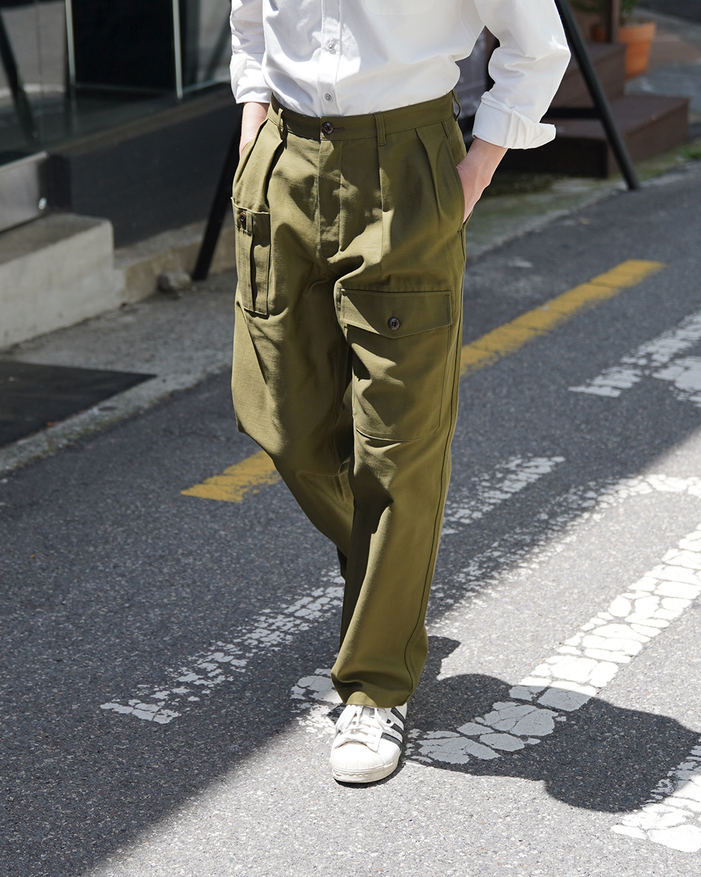COSMO TEXTILE社의 밀리터리 백 새틴 원단을 사용한 브리티시 배틀 드레스 트라우저입니다. 고르지 않은 무라사를 채택한 이 원단은 보다 캐주얼한 텍스쳐를 보여주며 세탁 시 워싱감과 독특한 아타리감이 나타납니다. 1943년에 트로피칼 배틀 유니폼을 채용한 영국군은 1941년 미국 루즈벨트 대통령이 제정한 랜드리스 법에 의해 미국에서 생산된 그린 컬러의 제품을 공급받게 됩니다. 주로 미군에서 사용되는 HBT 원단과 버튼 및 버클이 사용되었습니다. 반츠에서는 이에 힌트를 얻어 미군에서 많이 사용한 백 새틴 원단을 사용하게 되었습니다. 앞판의 비대칭의 패치 포켓과 역방향의 투턱 디테일을 재현하였으며, 당시에 생산되던 제품답게 너른 허벅지 너비와 테이퍼드 실루엣을 구현하였습니다. 허리 부분은 좀 더 현대적인 디자인을 적용시켜 착용하기 쉽게 디자인 하였습니다. 각 디테일을 정교하게 마감한 봉제와 바텍으로 퀄리티를 높였습니다.