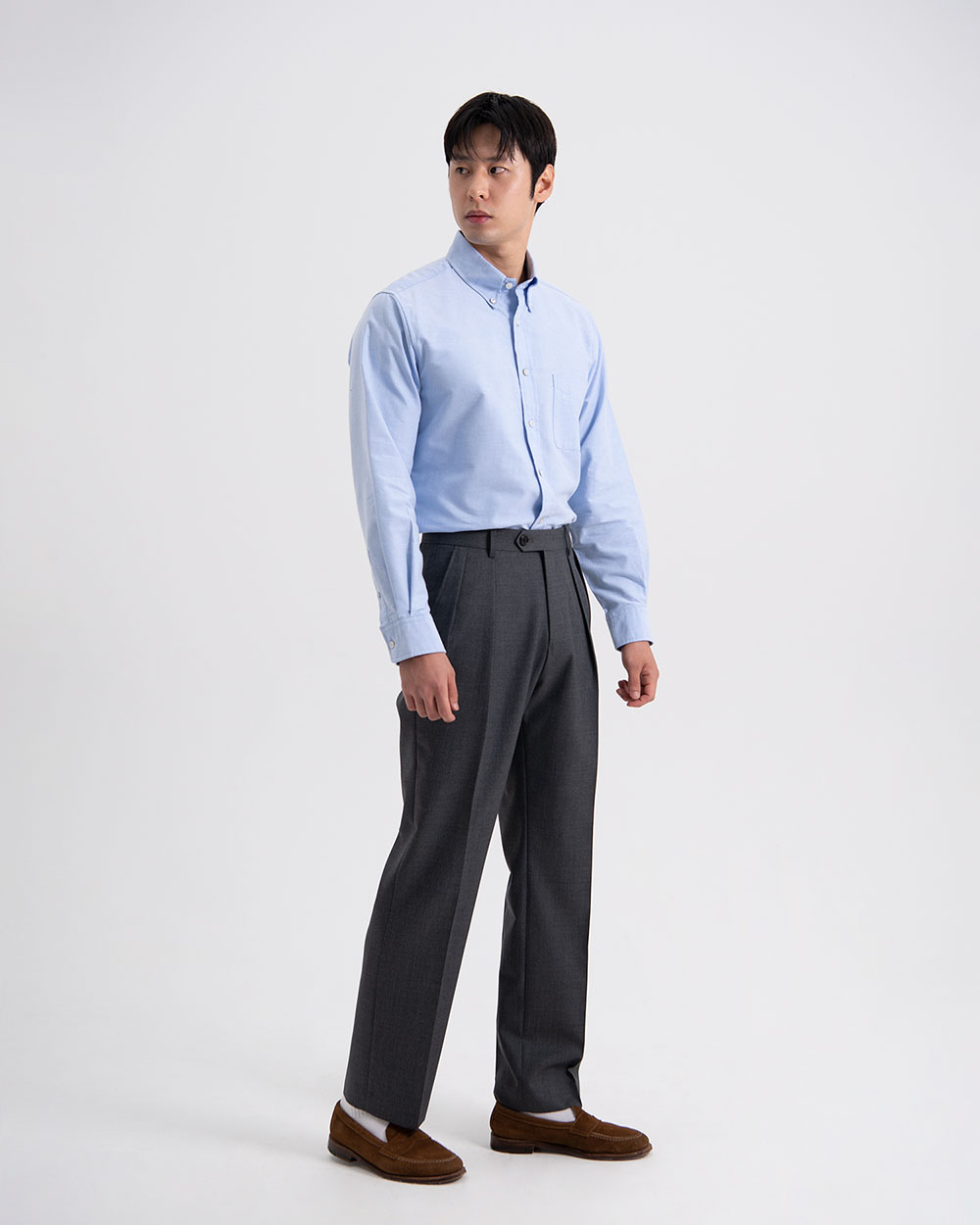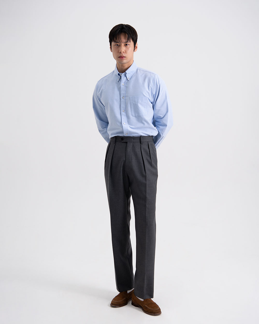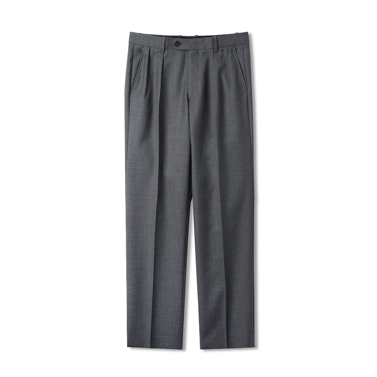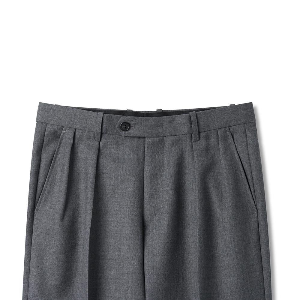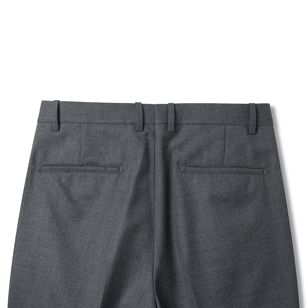 가장 기본이 되는 아이템 중 하나인 그레이 컬러의 우스티드 울 팬츠입니다. 여름을 제외한 모든 계절에 착용할 수 있는 소재를 사용했습니다. 실용적이고 자주 입을 수 있는 팬츠를 만들고자 맵시 있는 실루엣과 편안한 착용감에 중점을 두었습니다. 가볍지만 탄탄한 소재를 사용하여 고급스러우면서도 탄력있는 원단감에 반츠의 실루엣이 더해져있습니다. 역방향의 투턱 디테일로 밑위 라인을 우아하게 잡아주는 기능뿐 아니라 디자인적으로도 심미성을 보여줍니다. 셔츠와 타이를 매치하였을 때는 클래식하게, 플란넬 셔츠나 니트를 매치하였을 때는 캐주얼하게 다양한 방면으로 착용이 가능한 활용도 높은 제품입니다.