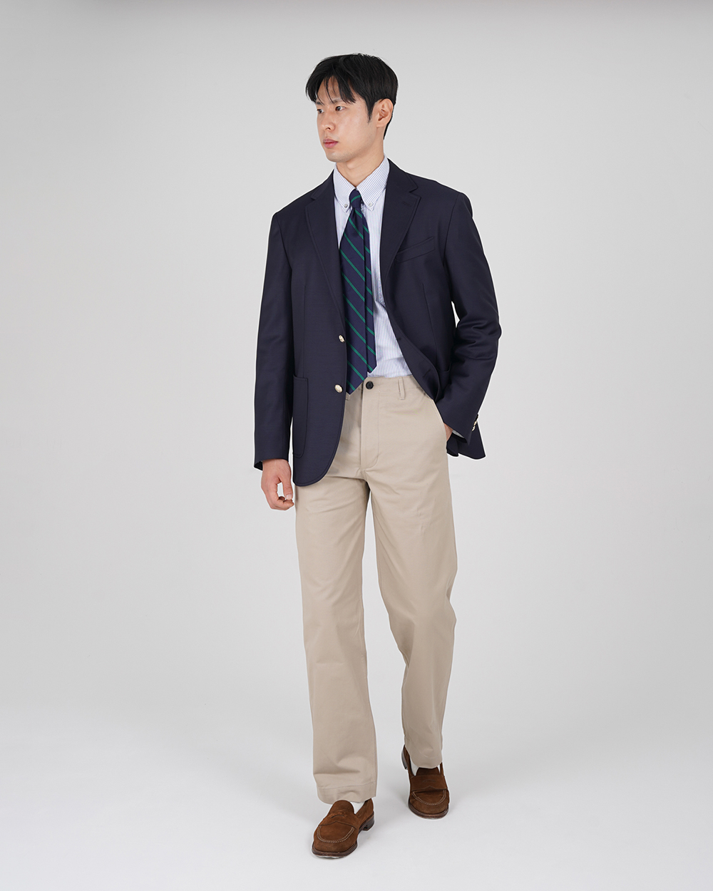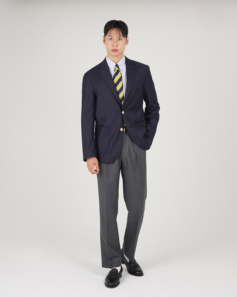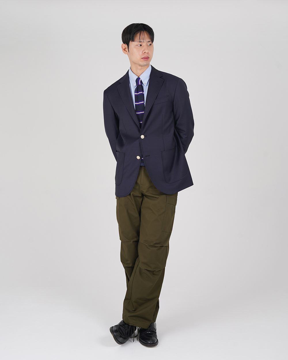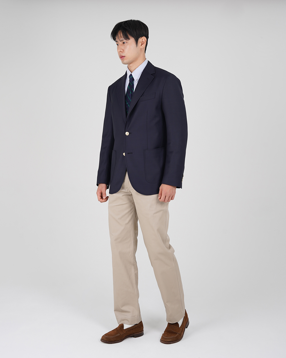 금장 버튼이 인상적인 우스티드 울 블레이저입니다. 블레이저는 프레피룩을 대표하는 아이템입니다. 금장버튼이 불꽃처럼 빛난다라고 하여 섬광을 뜻하는 blaze가 붙게 되었다는 설이 있습니다. 네이비 컬러의 원단에 금장버튼을 사용하여 전형적인 블레이저의 모습을 재현하였습니다. 여름을 제외한 모든 계절에 착용할 수 있는 우스티드 울 소재를 사용했습니다. 실용적이고 자주 입을 수 있는 자켓을 만들고자 맵시 있는 실루엣과 편안한 착용감에 중점을 두었습니다. 가볍지만 탄탄한 소재를 사용하여 고급스러우면서도 탄력있는 원단감에 반츠의 실루엣이 더해져있습니다. 투 버튼에 적당한 너비의 라펠 그리고 아웃포켓 디테일로 캐주얼 무드에 적합한 디자인을 채용하였습니다. 울 팬츠와 타이를 매치하여 클래식한 느낌을 연출하는 것 외에도 치노팬츠나 스웻 아이템들과의 조합도 가능합니다. 옷장에서 오랫동안 활약할 수 있는 클래식 아이템입니다.