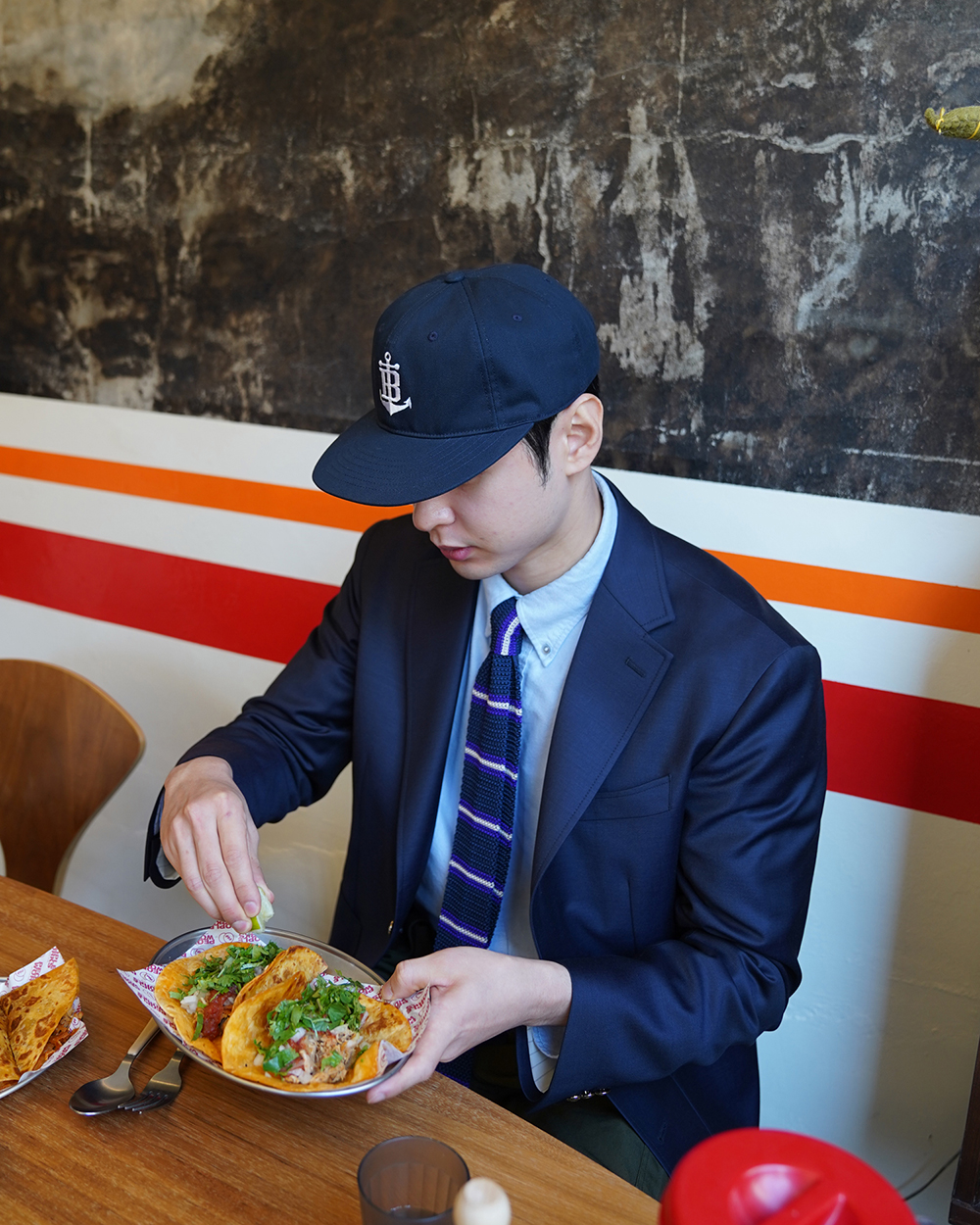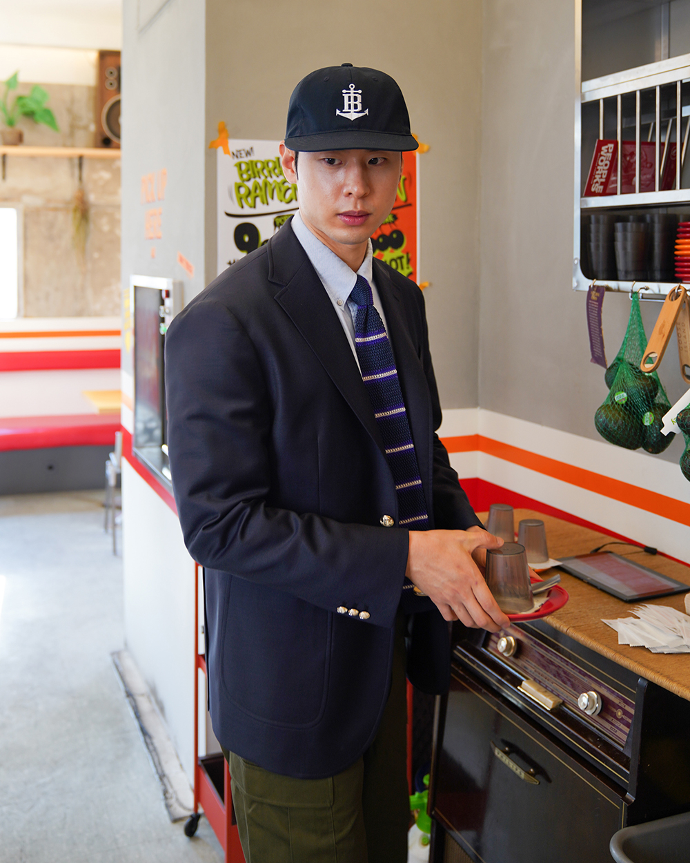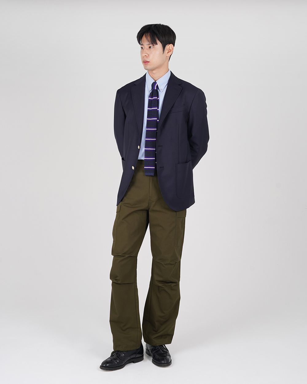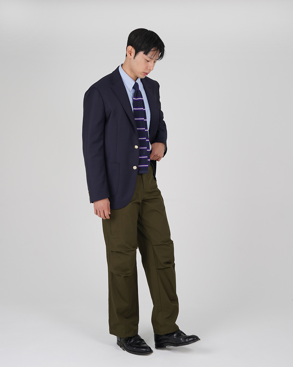 금장 버튼이 인상적인 우스티드 울 블레이저입니다. 블레이저는 프레피룩을 대표하는 아이템입니다. 금장버튼이 불꽃처럼 빛난다라고 하여 섬광을 뜻하는 blaze가 붙게 되었다는 설이 있습니다. 네이비 컬러의 원단에 금장버튼을 사용하여 전형적인 블레이저의 모습을 재현하였습니다. 여름을 제외한 모든 계절에 착용할 수 있는 우스티드 울 소재를 사용했습니다. 실용적이고 자주 입을 수 있는 자켓을 만들고자 맵시 있는 실루엣과 편안한 착용감에 중점을 두었습니다. 가볍지만 탄탄한 소재를 사용하여 고급스러우면서도 탄력있는 원단감에 반츠의 실루엣이 더해져있습니다. 투 버튼에 적당한 너비의 라펠 그리고 아웃포켓 디테일로 캐주얼 무드에 적합한 디자인을 채용하였습니다. 울 팬츠와 타이를 매치하여 클래식한 느낌을 연출하는 것 외에도 치노팬츠나 스웻 아이템들과의 조합도 가능합니다. 옷장에서 오랫동안 활약할 수 있는 클래식 아이템입니다.