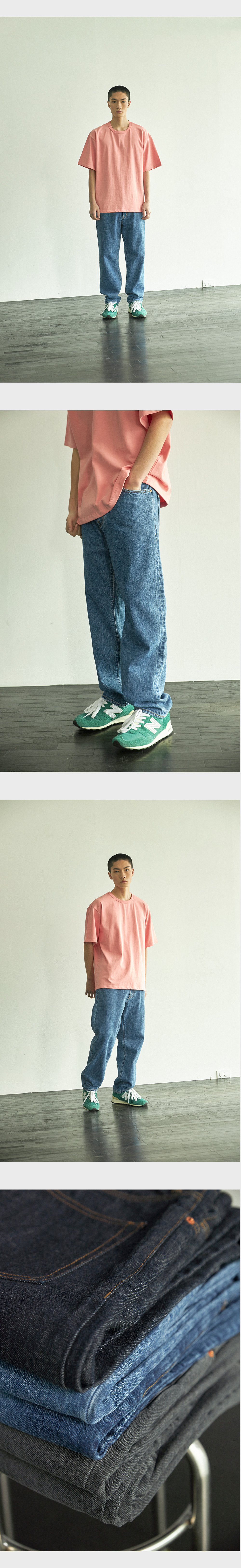 아래로 갈수록 좁아지는 클래식 테이퍼드 실루엣. 체인스티칭 봉제방식이 사용되어 옆선과 밑단이 자연스럽게 돌아가있는 구조입니다.