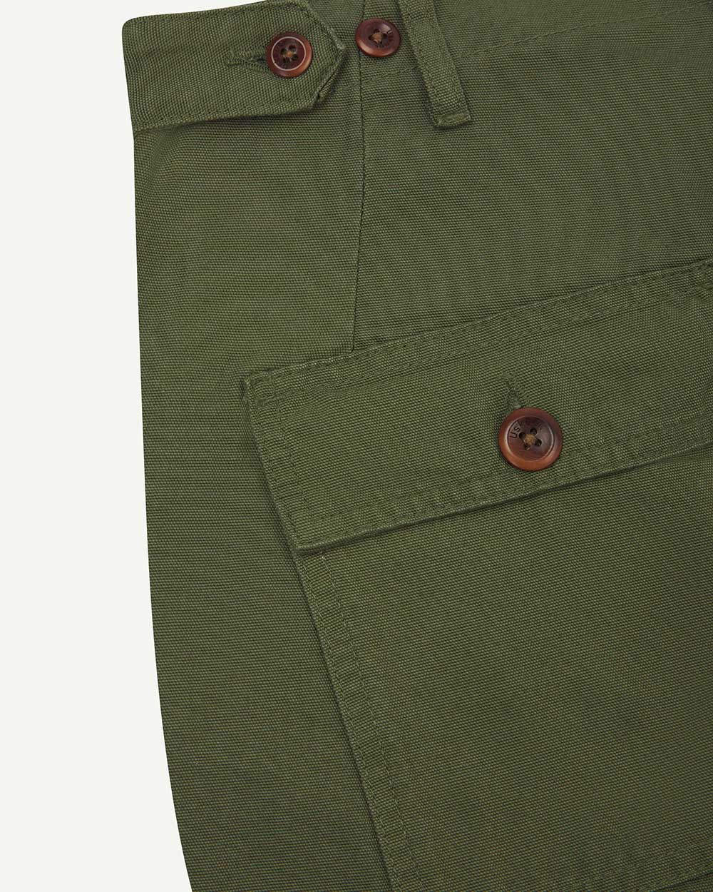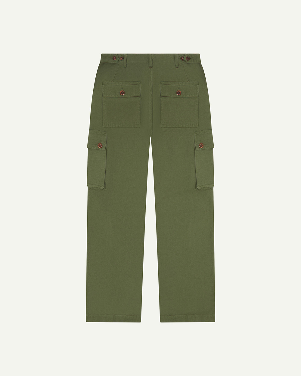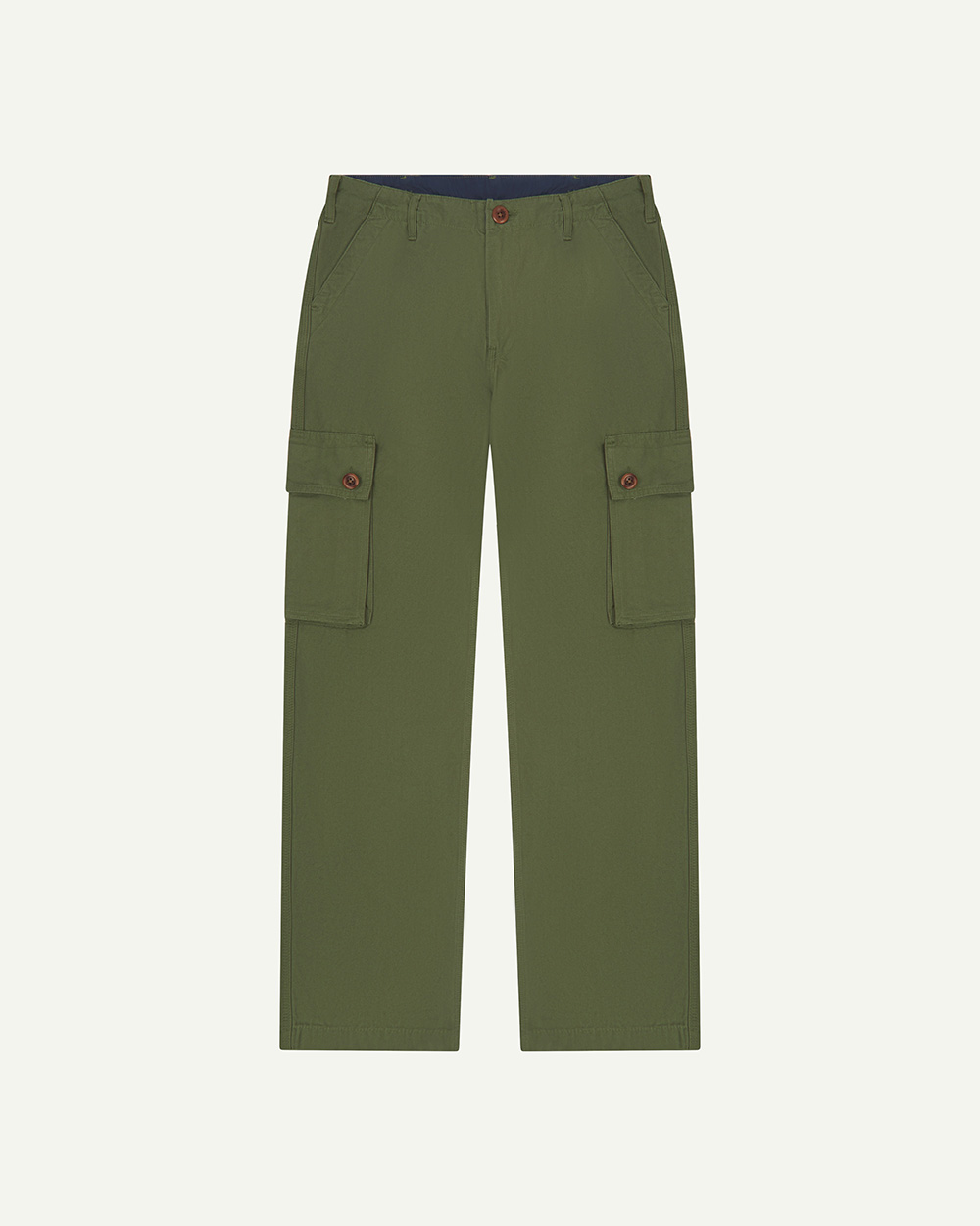 카고에서 영감을 받은 이 바지는 실용성이 최우선으로 합니다. 코로조 버튼으로 고정된 넉넉한 크기의 플랩 포켓이 있어 수납이 매우 용이 합니다. 와이드 레그 형태로 편하게 착용 가능하며, 100% 오가닉 코튼 소재로 전체 스타일에 약간의 입체감을 더합니다. 카고 팬츠는 약간 오버 사이즈입니다. 한 치수 다운해서 구매하시는 것을 추천 합니다. 예를 들어, 보통 32"를 입는다면 "30-32"를 선택 하시면 됩니다.