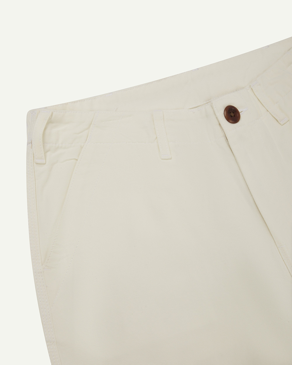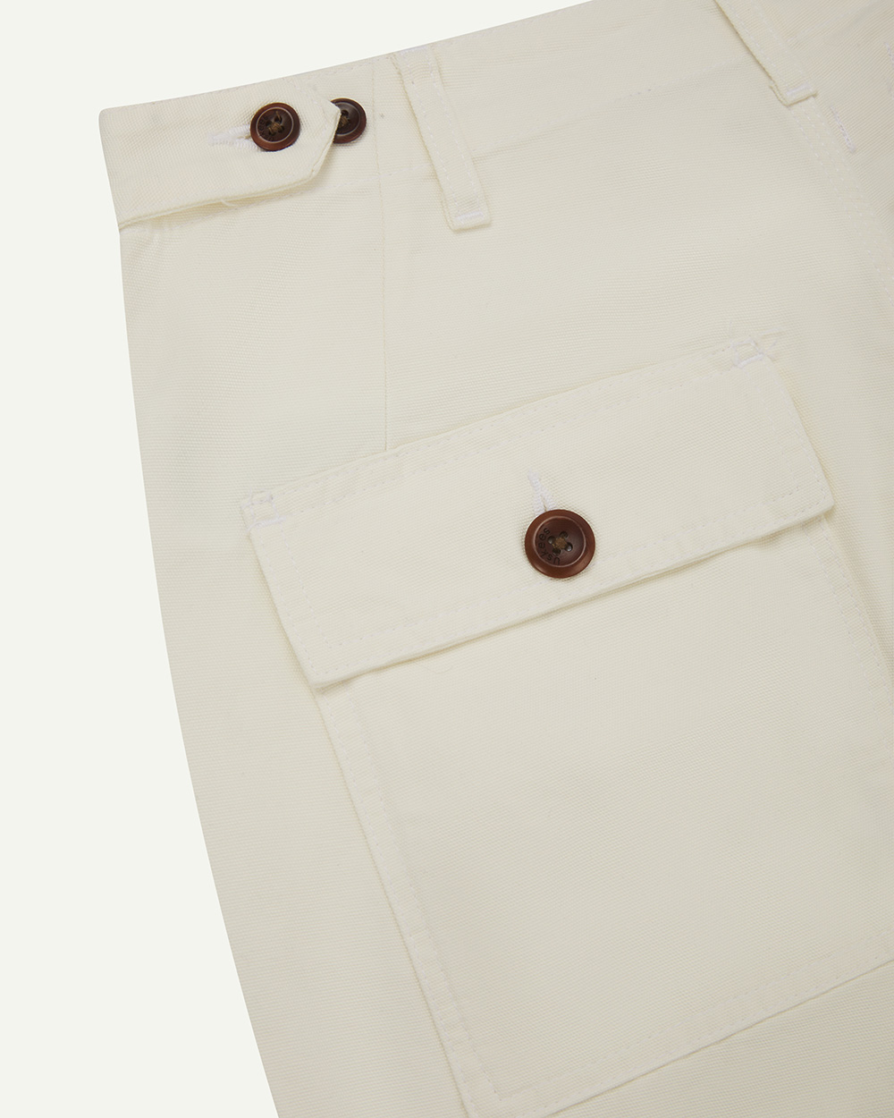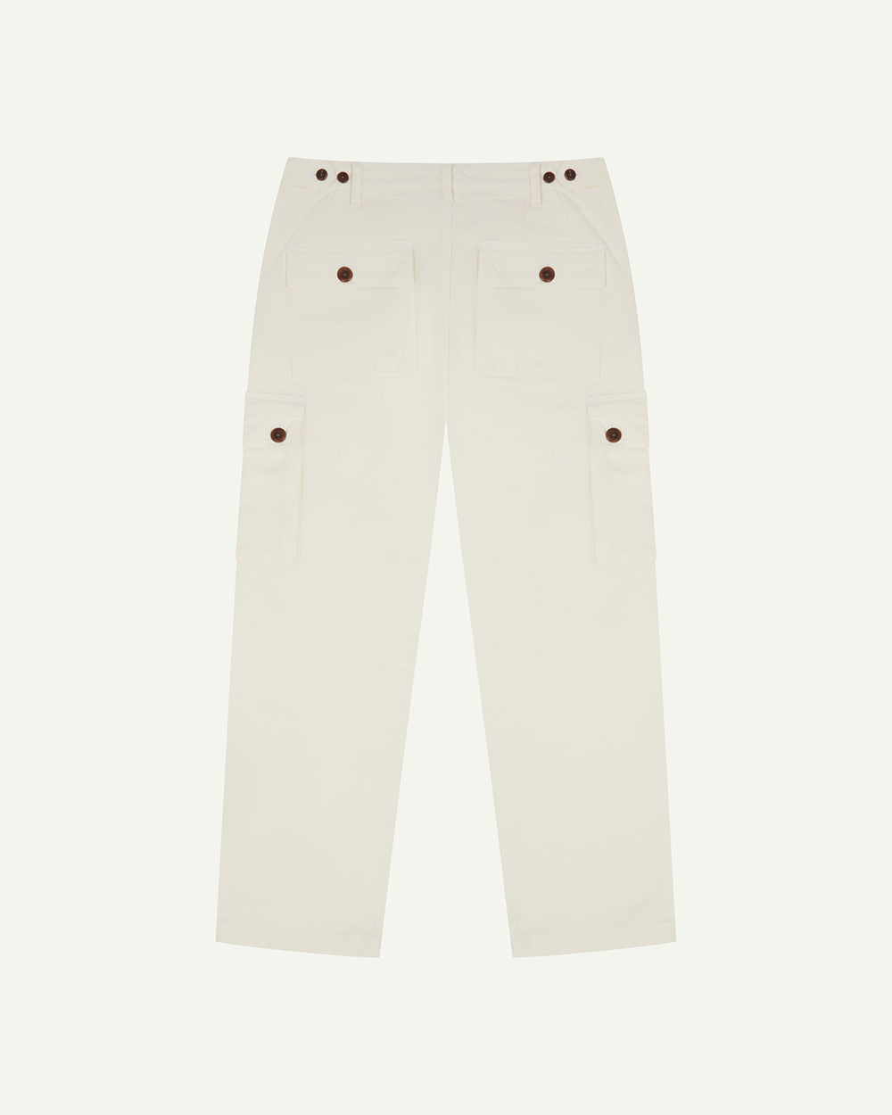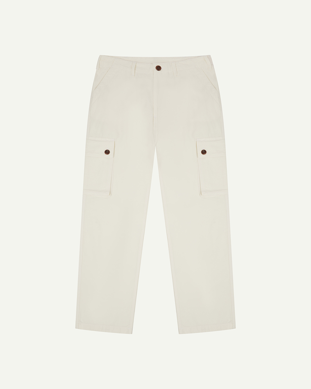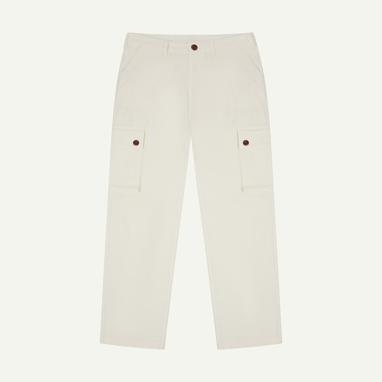카고에서 영감을 받은 이 바지는 실용성이 최우선으로 합니다. 코로조 버튼으로 고정된 넉넉한 크기의 플랩 포켓이 있어 수납이 매우 용이 합니다. 와이드 레그 형태로 편하게 착용 가능하며, 100% 오가닉 코튼 소재로 전체 스타일에 약간의 입체감을 더합니다. 카고 팬츠는 약간 오버 사이즈입니다. 한 치수 다운해서 구매하시는 것을 추천 합니다. 예를 들어, 보통 32"를 입는다면 "30-32"를 선택 하시면 됩니다.