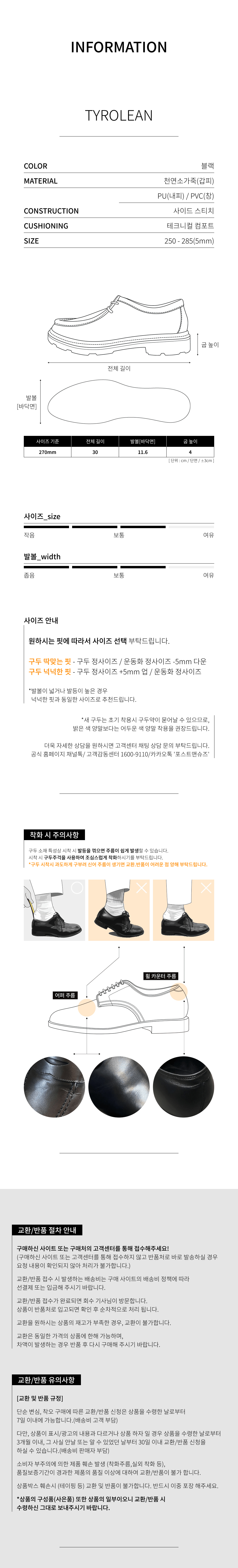 소재 – 천연소가죽(갑피), PU(내피), PVC(창)