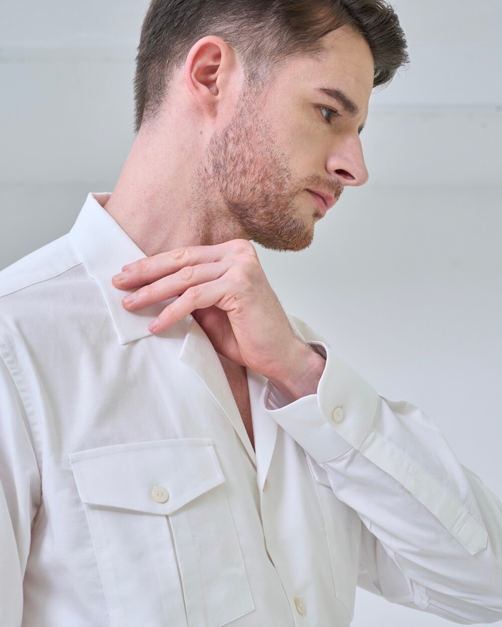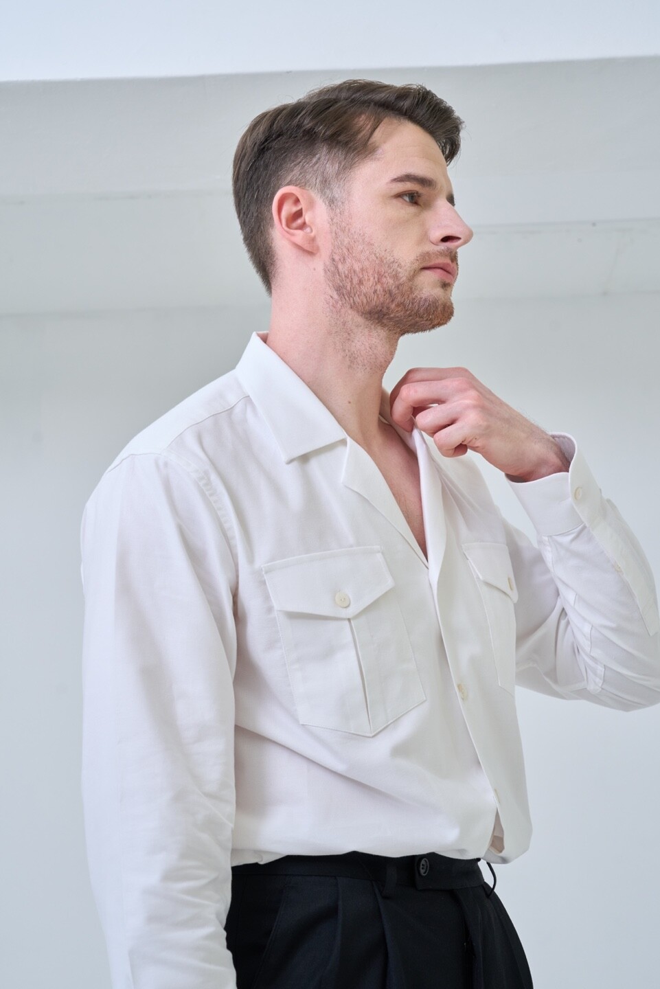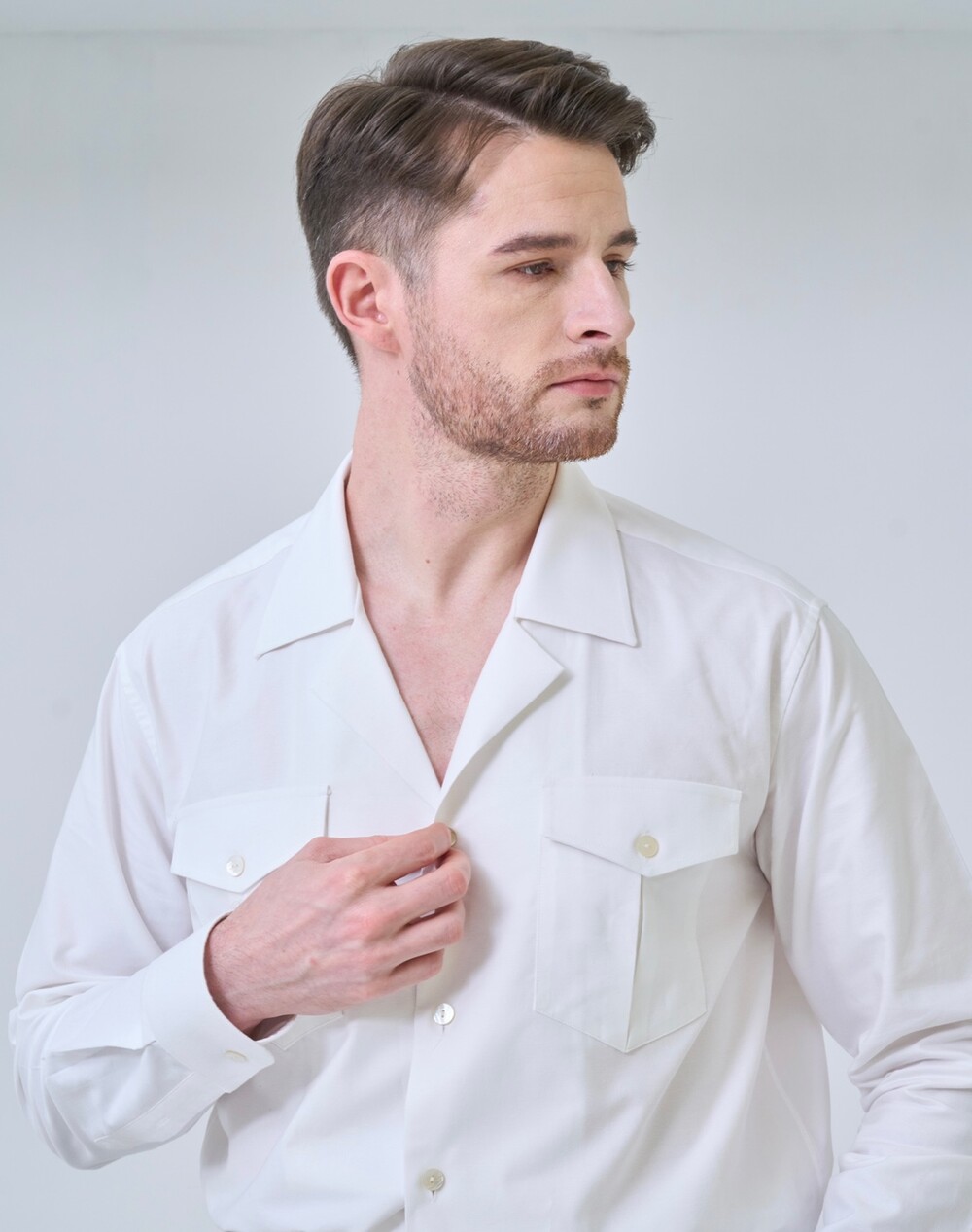두터운 순면 30수 옥스포드 원단을 활용해 제작한 사파리 셔츠입니다. 일반 오픈 칼라보다는 깊은 깊이감이며, 5개의 단추 여밈으로 이루어져 있습니다. 단추는 고급 천연 자개단추를 사용하였습니다. 양쪽 인버티드 체스트 포켓을 활용한 사파리 셔츠의 디테일입니다. 클래식/캐주얼 웨어로 활용도 높고 내구성 좋은 셔츠로 추천하는 제품입니다.