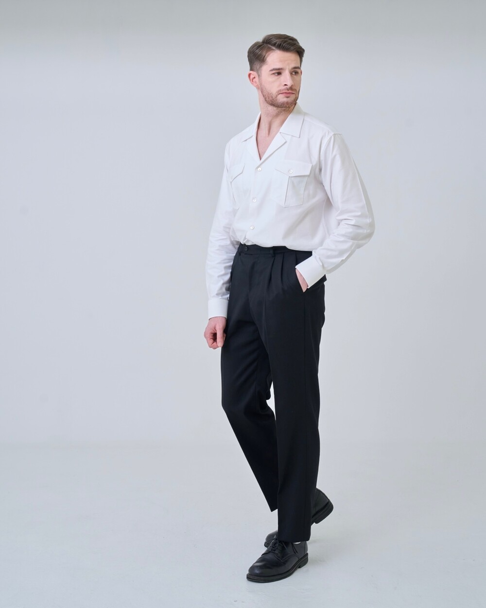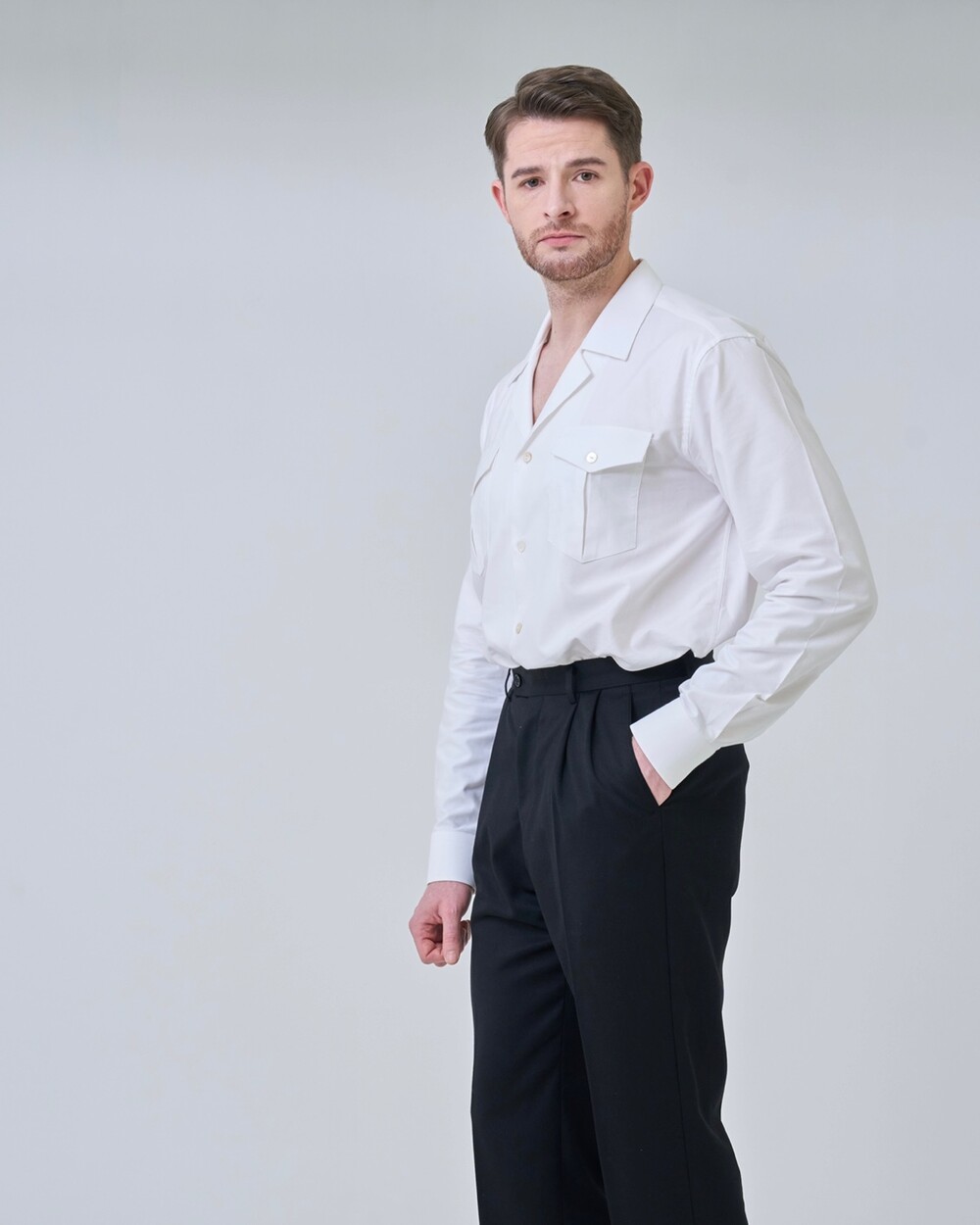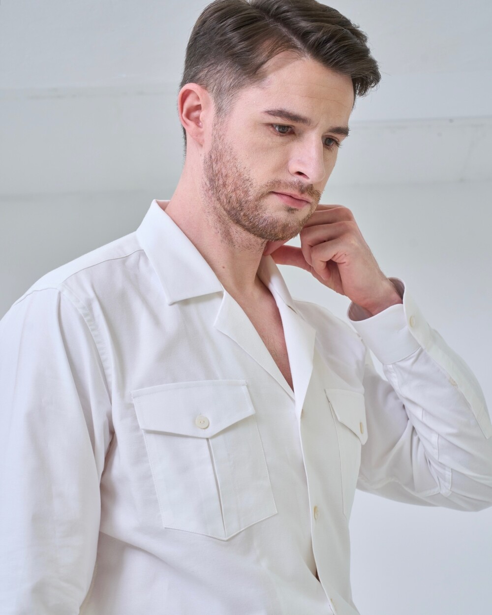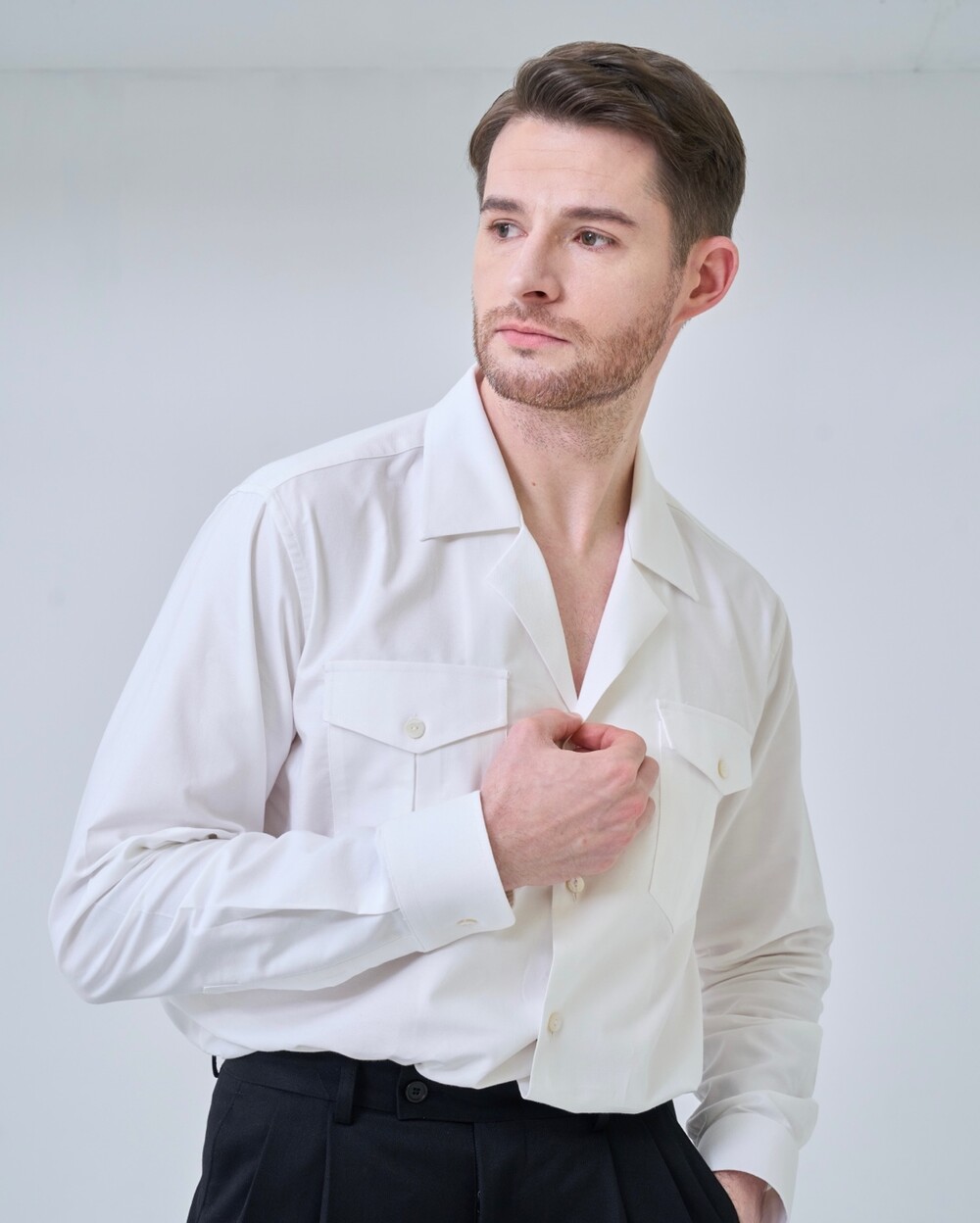 두터운 순면 30수 옥스포드 원단을 활용해 제작한 사파리 셔츠입니다. 일반 오픈 칼라보다는 깊은 깊이감이며, 5개의 단추 여밈으로 이루어져 있습니다. 단추는 고급 천연 자개단추를 사용하였습니다. 양쪽 인버티드 체스트 포켓을 활용한 사파리 셔츠의 디테일입니다. 클래식/캐주얼 웨어로 활용도 높고 내구성 좋은 셔츠로 추천하는 제품입니다.