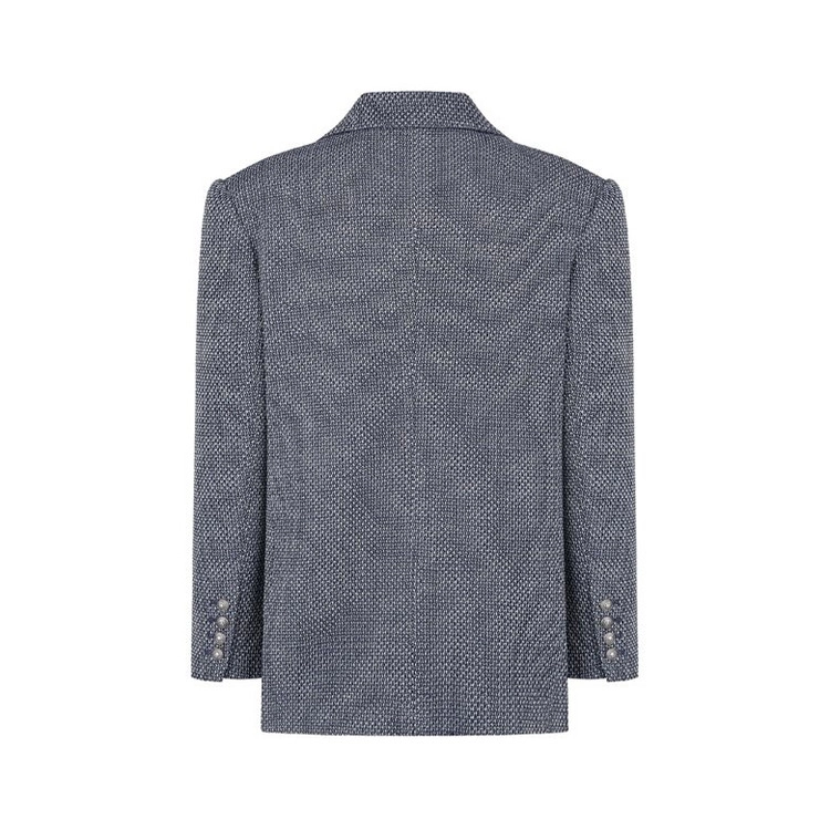 SPRING24 시즌 RTW/MTO 수트 라인으로 출시된 스포츠 재킷입니다. 스포츠 코트라고 불리기도 하는데, 스포츠 전용 재킷이나 스포티 룩으로 활용하는 캐주얼한 상의를 총칭합니다. 캐주얼한 디테일로 아웃 포켓이나 사이드 벤트가 포함되었습니다. 니트 자가드와 같은 부드러운 터치감의 이태리 마르조또 사의 원단입니다. 네이비와 화이트 컬러가 체인처럼 엮인 디테일입니다. 고급 이태리 은장 단추를 활용하였습니다. 봄 세퍼레이션 재킷으로 추천하는 제품입니다.
